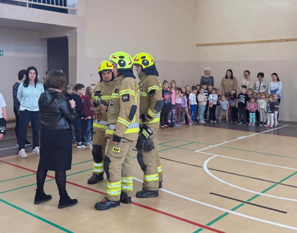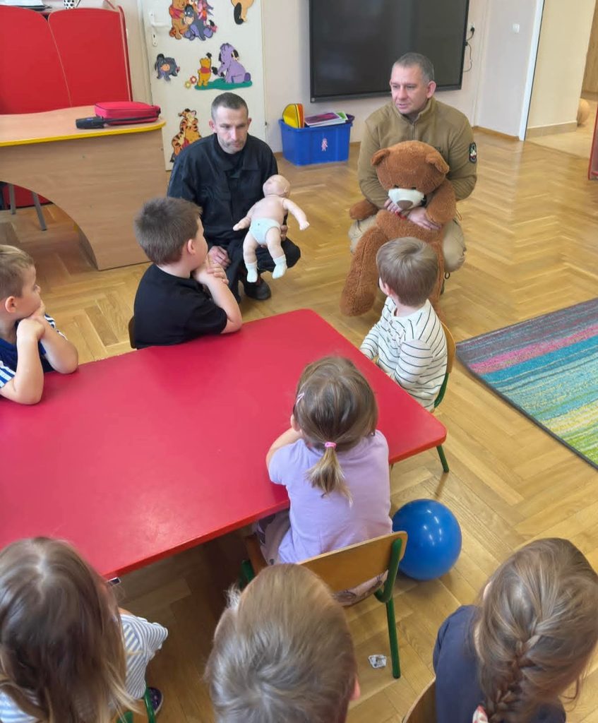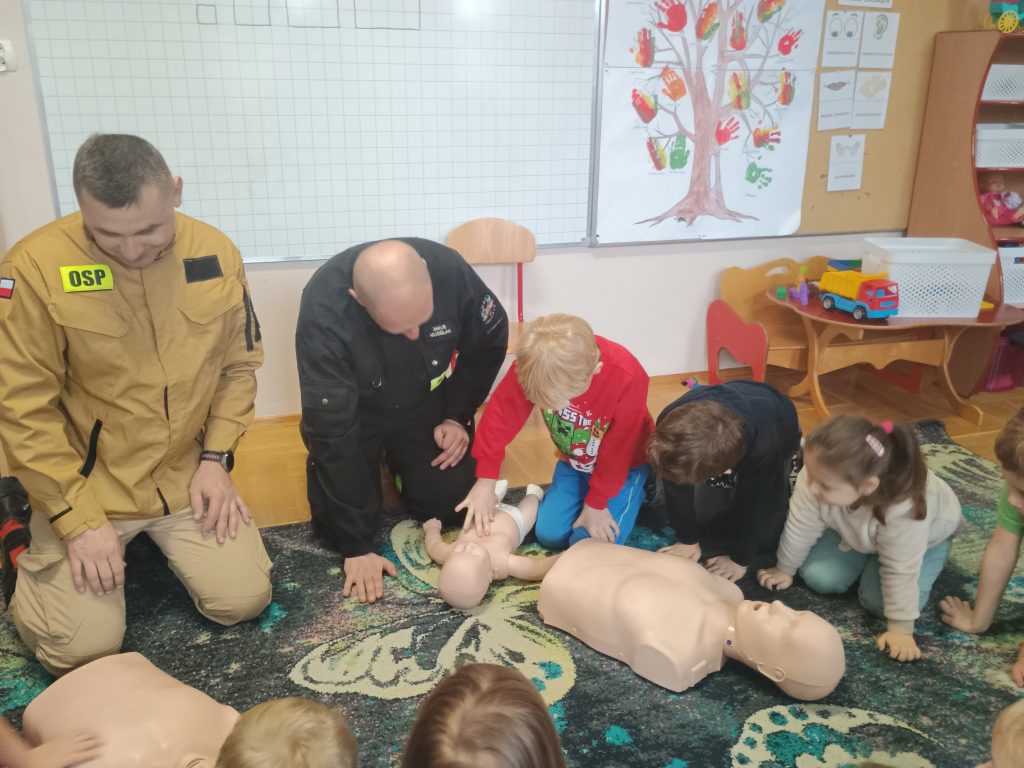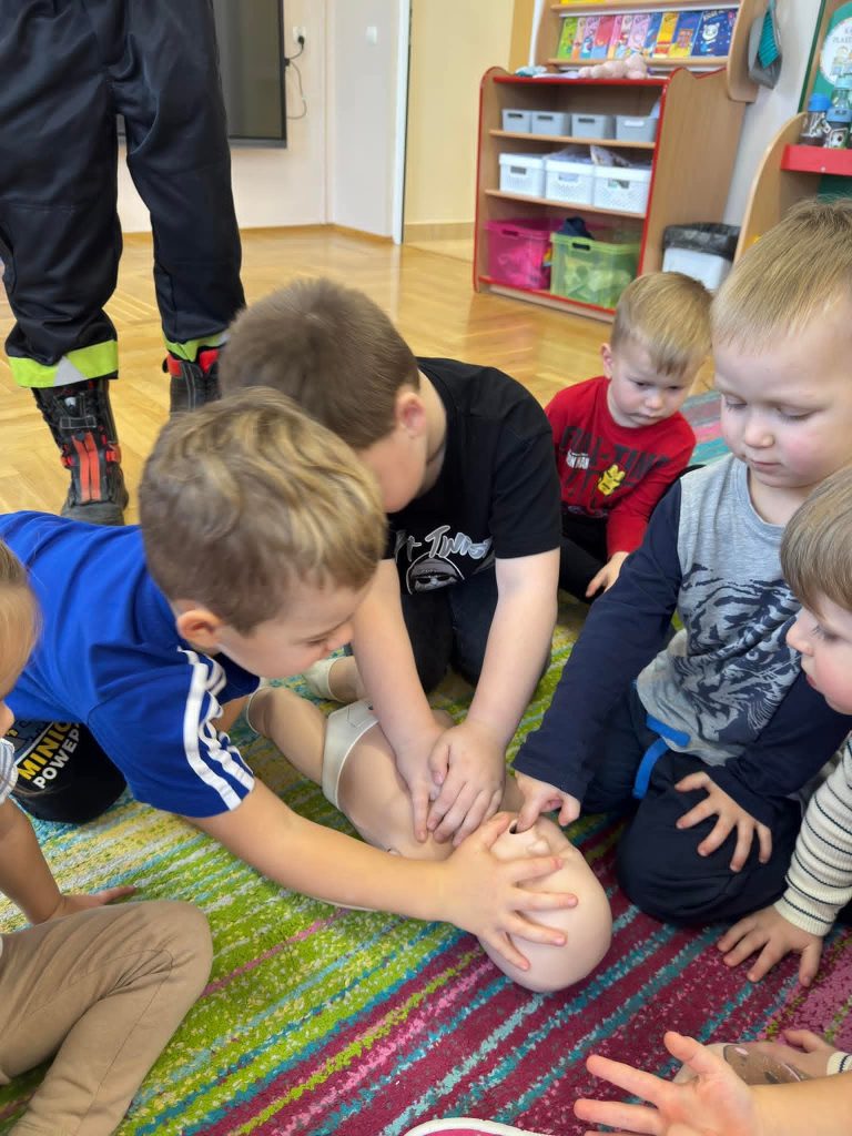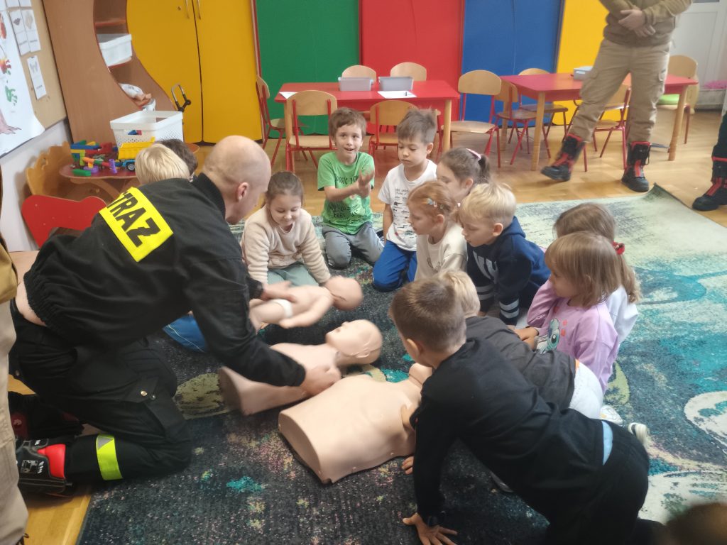 W czwartek o godzinie 9.30 w budynku szkoły rozległ się sygnał alarmowy. Dzieci wraz z wychowawcami natychmiast rozpoczęły ewakuację z sal, kierując się wyznaczoną drogą na miejsce zbiórki. Cała akcja przebiegła spokojnie, a przedszkolaki doskonale poradziły sobie z realizacją poleceń. Po zakończonym alarmie przedszkole odwiedzili strażacy, którzy przeprowadzili zajęcia dostosowane do wieku dzieci. W przystępny sposób opowiedzieli o tym, jak rozpoznać niebezpieczną sytuację, kiedy wezwać pomoc oraz jak zachować się wobec osoby poszkodowanej. Dzieci miały okazję nauczyć się, jak prawidłowo wezwać numer 112, zobaczyć, jak wygląda pozycja bezpieczna, poćwiczyć uciskanie klatki piersiowej na fantomie,