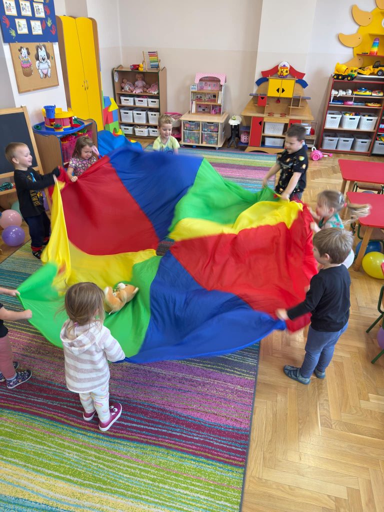 Tego dnia w przedszkolu panowała prawdziwie sportowa atmosfera! Dzieci wzięły udział w różnorodnych zabawach ruchowych i konkurencjach sportowych, takich jak tor przeszkód, przeciąganie liny, wyścigi drużynowe czy zabawy z piłkami i woreczkami. Wszyscy wykazali się ogromnym zaangażowaniem, sprytem i poczuciem fair play.
