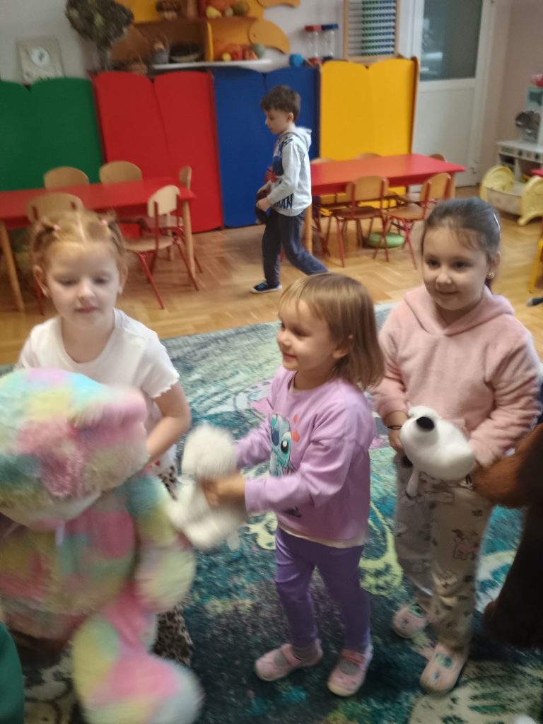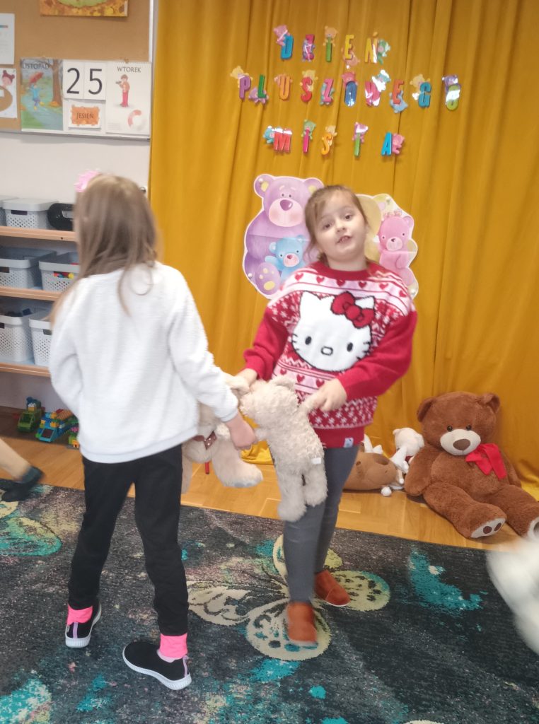 Były także gry i zabawy z misiem. Ten dzień był okazją do nauki współpracy, dzielenia się radością i budowania więzi. Atmosfera była pełna ciepła i przyjaźni- zarówno między dziećmi jak ich ukochanymi pluszakami.